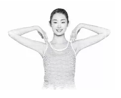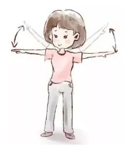 双手从侧平举(9点15分)举到10点10分处,反复练,以感到颈部肌肉酸胀为宜。