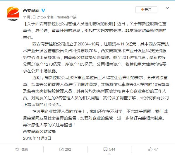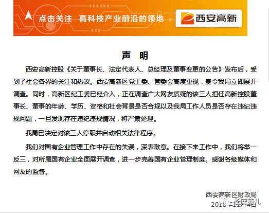 全文如下:声 明西安高新控股《关于董事长、法定代表人、总经理及董事变更的公告》发布后,受到了社会各界的关注和热议西安高新区党工委、管委会高度重视,责令我局立即展开调查同时,高新区纪工委已经介入,正在调查广大网友质疑的该三人担任高新控股董事长、董事的年龄、学历、资格和社会背景是否合规以及我局工作人员是否存在违纪违规问题。