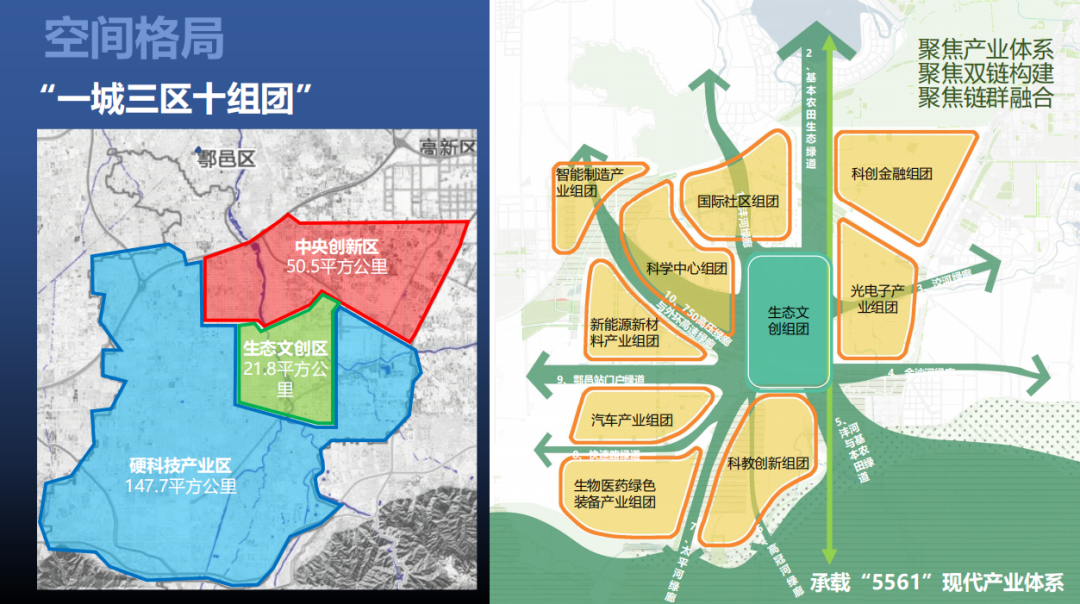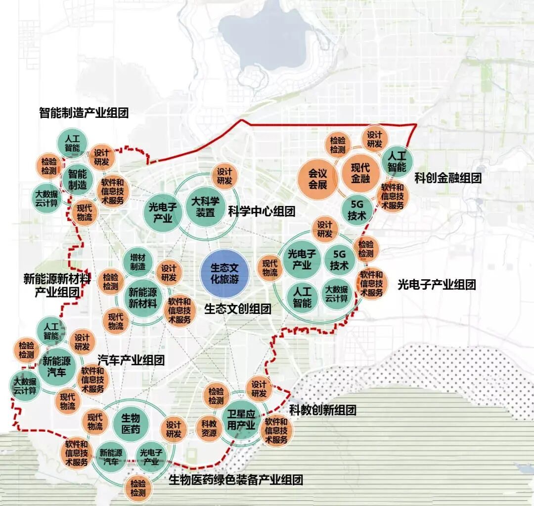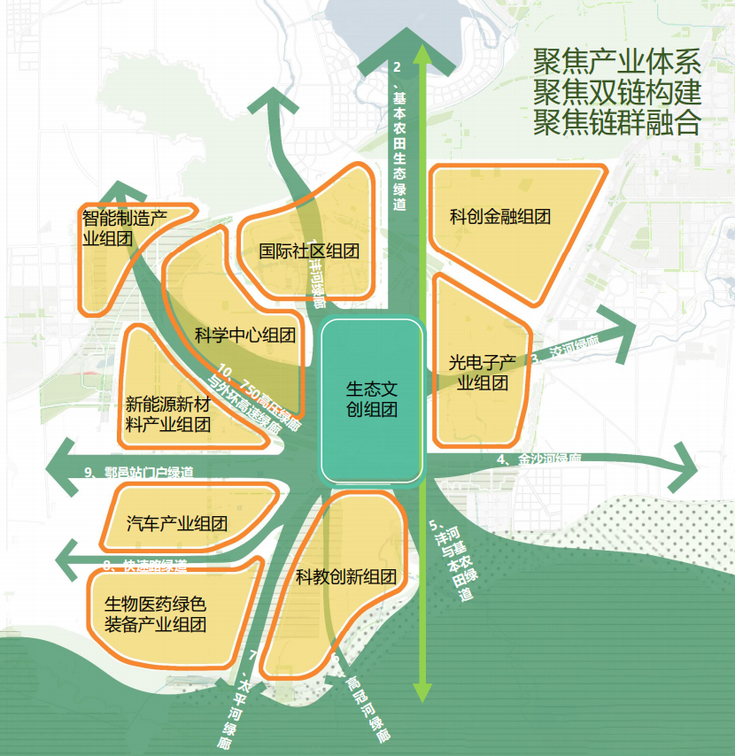 十组团:围绕“5561”现代产业体系,布局科创金融、国际社区、生态文创、科学中心、光电子产业、科教创新、生物医药绿西安休闲娱乐色装备、汽车产业、新能源新材料和智能制造等十个产业组团“大科学装置+科研机构+服务平台”。