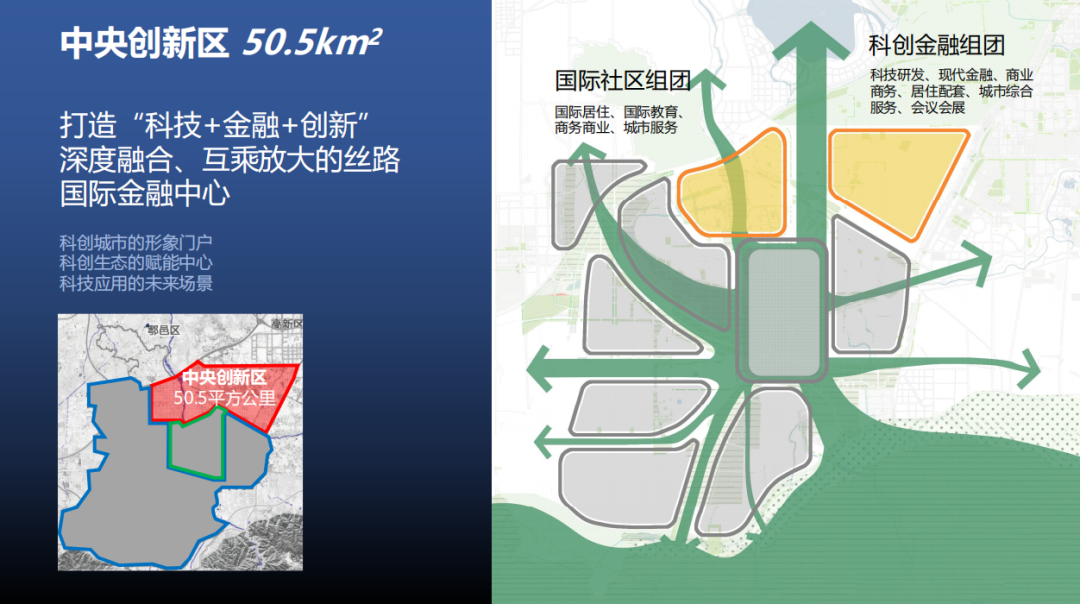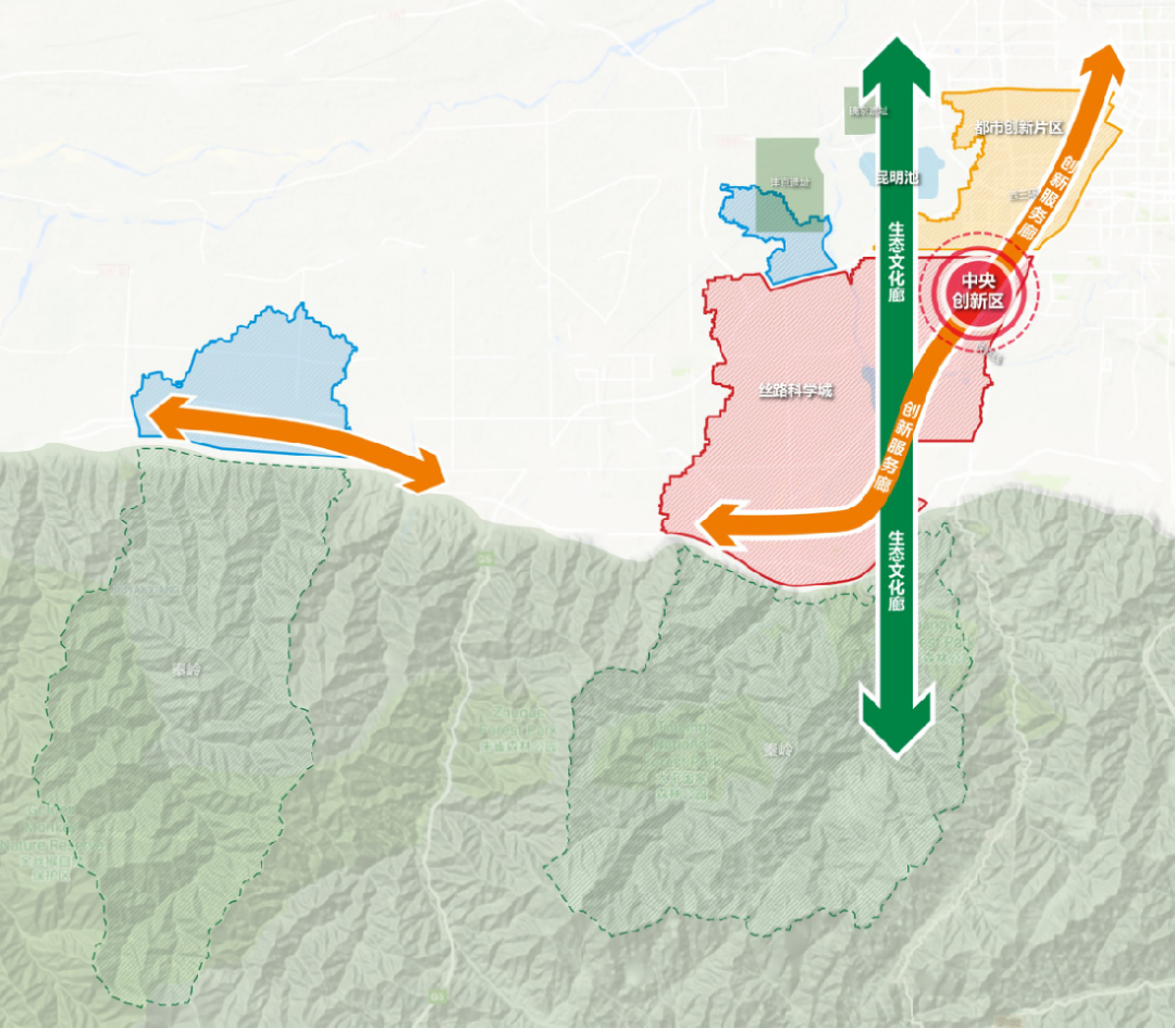 中央创新区:面积50.5km²,打造“科技+金融+创新”深度融合、互乘放大的丝路国际金融中心。生态文西安休闲娱乐创区:面积为21.8km²,以科技旅游、生态文创、商务会议为核心功能。