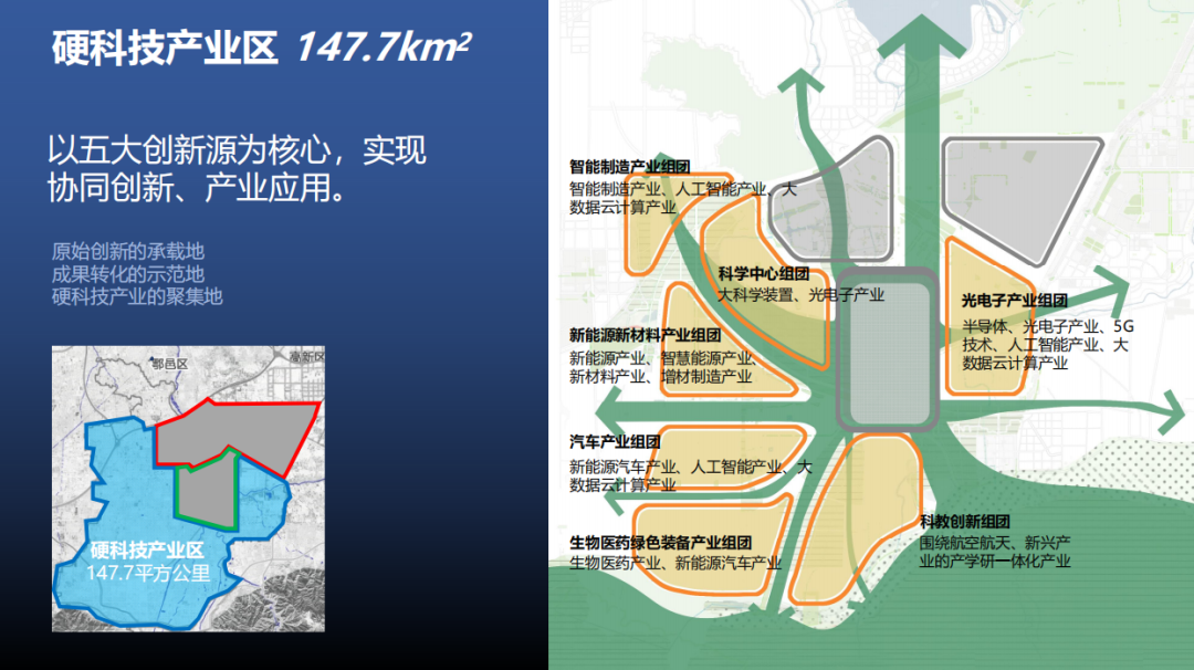 硬科技产业区:面积为147.7km²,以科研院所、高等院校、双创平台、龙头企业、国际创新这五大创新源为核心,实现协同创新、产业应用,原始创新的承载地、成果转化的示范地、硬科技产业的聚集地并为大科学装置预留区域。