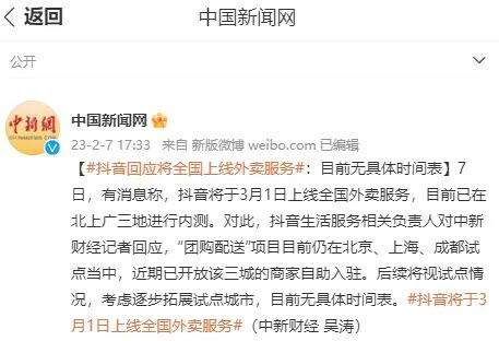 2月23日消息西安夜生活,据报道,多个茶饮品牌已被邀请“入驻”“抖音外卖”,现已提交申请,正在等待内测几天前,一则“抖音将于3月1日上线全国外卖服务”的消息,在网上引起关注针对将上线全国外卖服务一事,抖音生活服务相关负责人回应,“团购配送”项目目前仍在北京、上海、成都试点当中,近期已开放该三城的商家自助入驻。