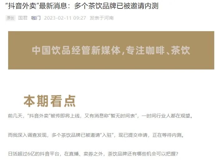 报道还指出,部分连锁茶饮品牌,在春节前就收到了内测邀请“2022年年底,抖音的KA负责人就和我们对接上了,邀请我们作为第一批内测品牌”一位茶饮品牌负责人表示据了解,目前行业内多个茶饮连锁品牌,都已经收到了内测邀请,“资料我们都已经提交过了,具体什么时候开始,在区域还是全国进行测试,暂未收到明确的信息。