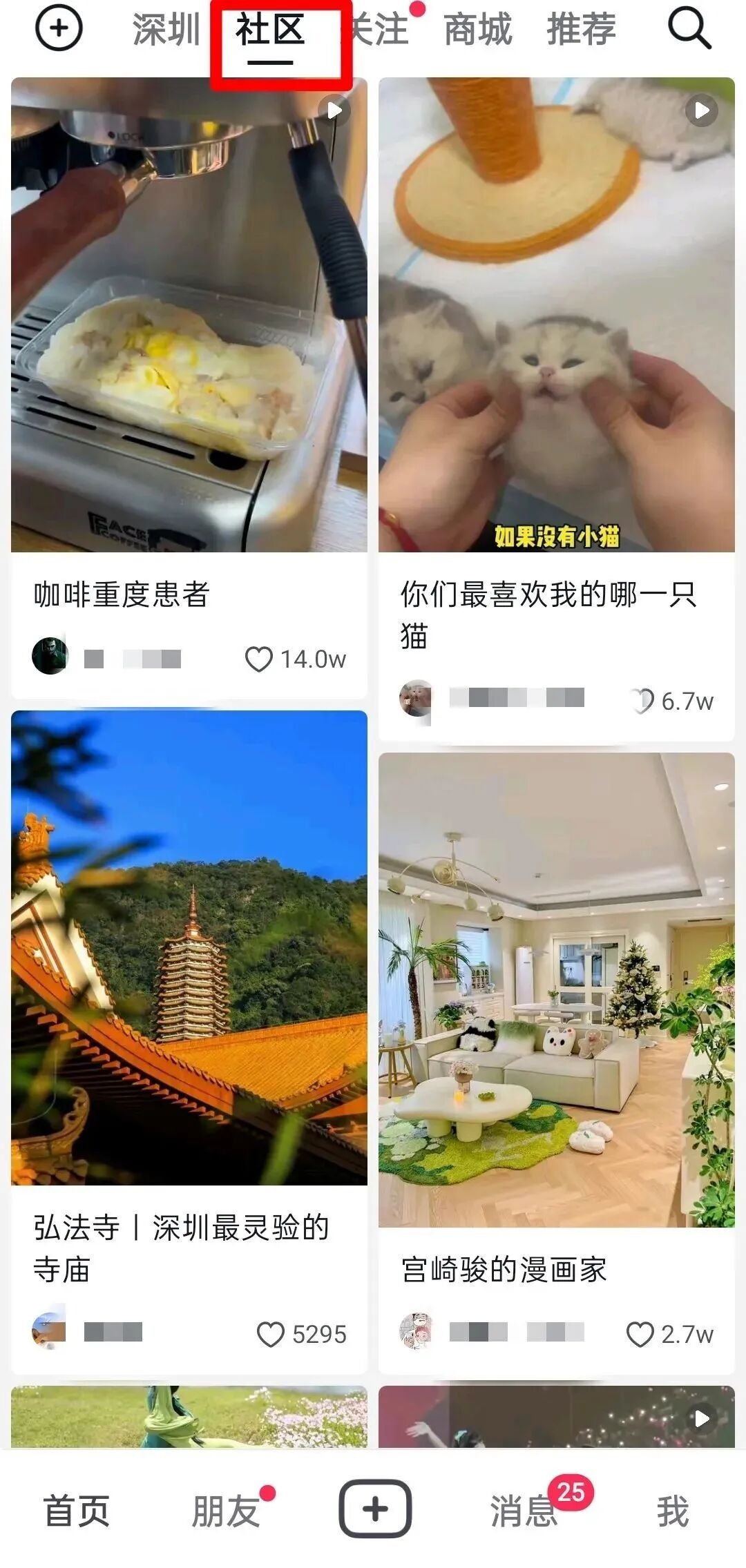 在抖音首页,和同城、商城、关注、推荐并列的顶部Tab栏,多了一个“社区”栏目。