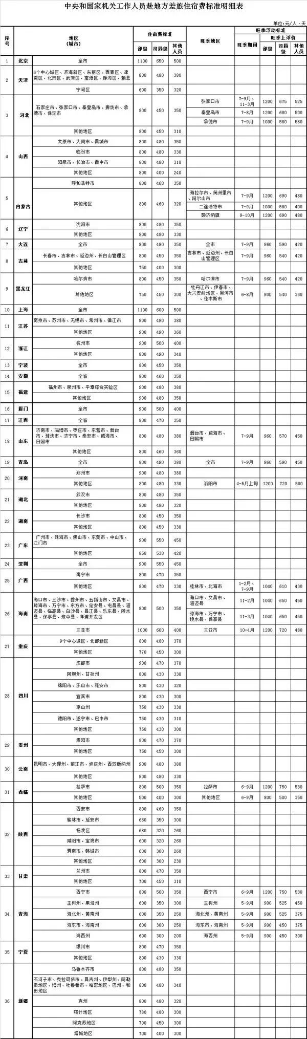 根据财政部的统一部署,目前,各地财政部门已将差旅住宿费标准细化到地市为方便执行,财政部将相关标准汇总整理后,制定了《中央和国家机关工作人员赴地方差旅住宿费标准明细表》,自2016年5月1日起执行。