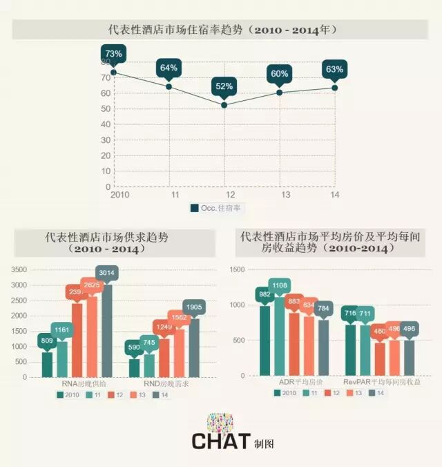 市场房晚供给量在该段时间中呈高速增长的态势,2012年的房晚供给量与2010年相比翻了整整3倍,同时,供给增长主要集中在2012年然而,在供给快速增长的同时,市场房晚需求的增长相对较为缓慢,导至市场平均住宿率从2010年的高点73%下降至2012年的52%。