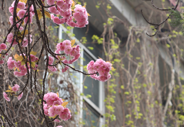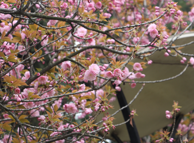 粉红的樱花映衬着寺内建筑特色的格局,交相掩映、煞是好看,园内被一片梦幻粉点缀。